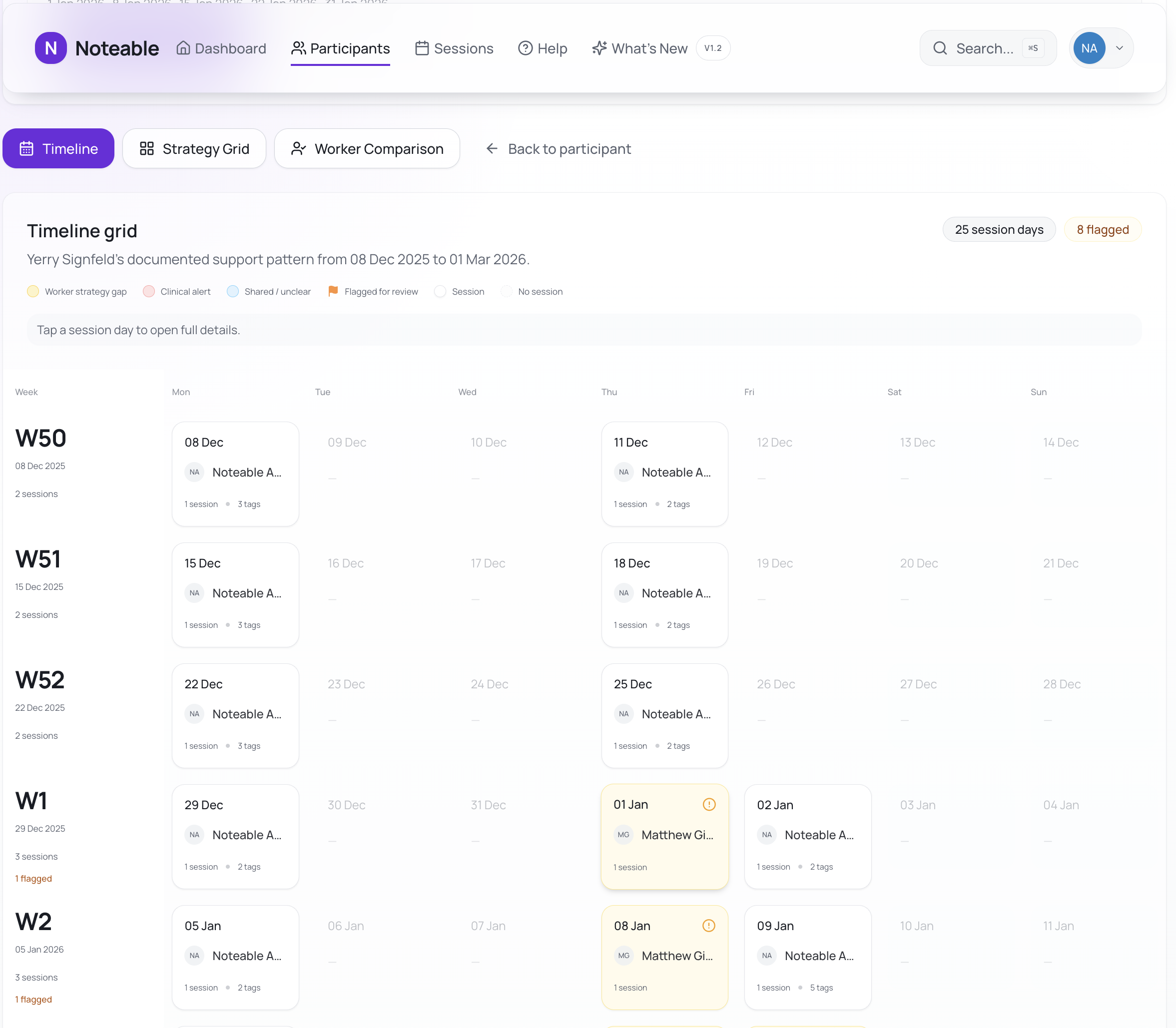 A day-by-day timeline across 8, 12, or 24 weeks reveals worker inconsistency, strategy gaps, and drift patterns — before a review forces the conversation.
